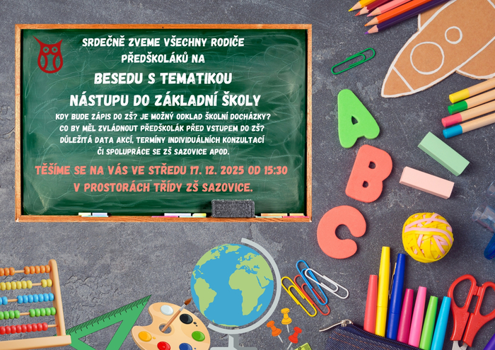 Zveme všechny rodiče předškoláků na BESEDU S TEMATIKOU NÁSTUPU DO ZÁKLADNÍ ŠKOLY